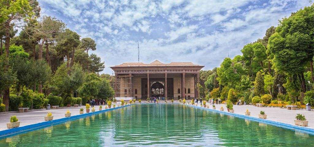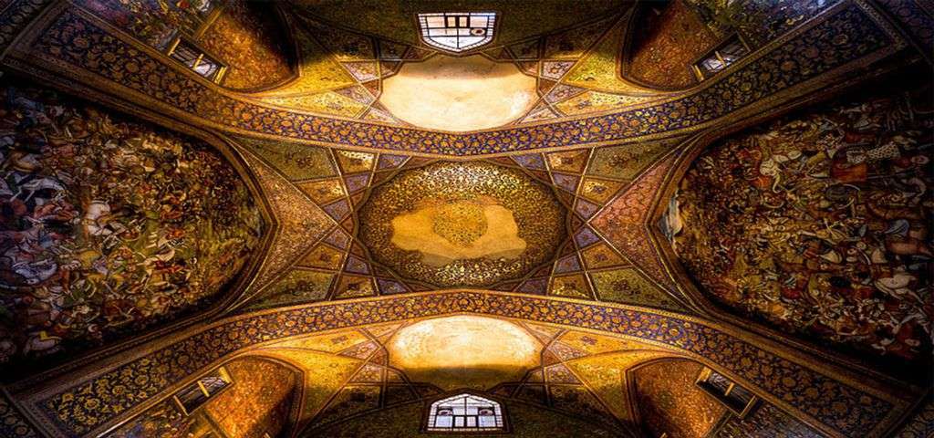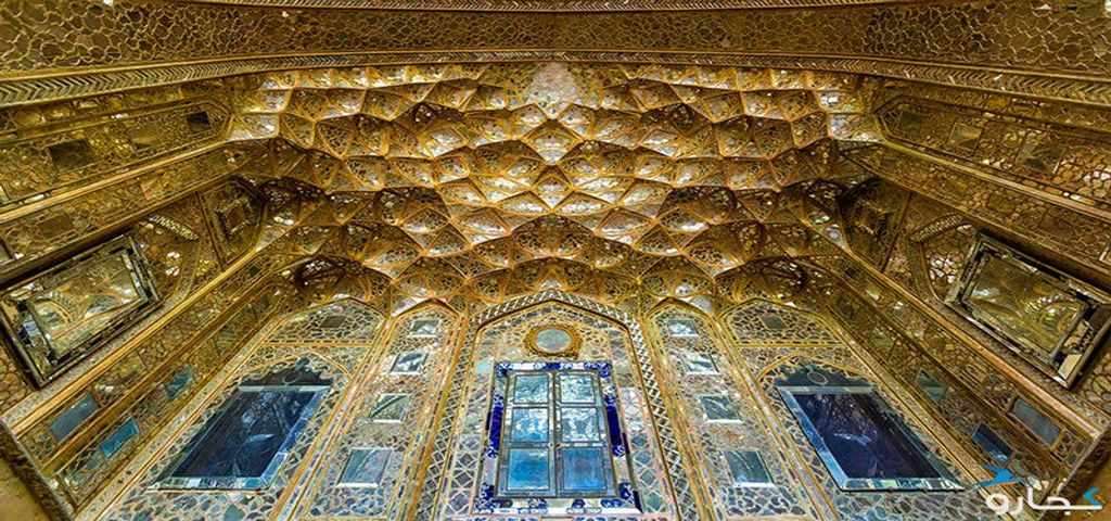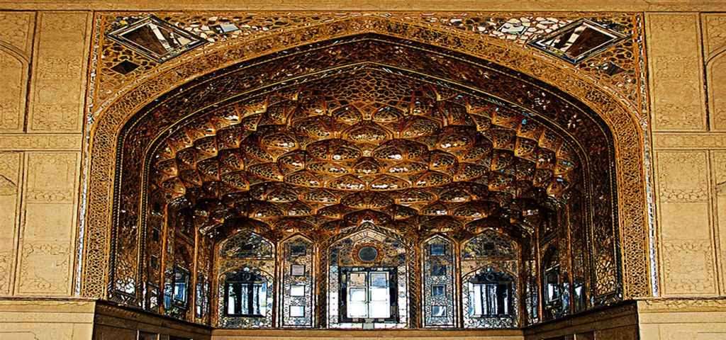 Mirror hall, the 18 Sotoun hall, the two large rooms north and south of the Mirror hall, the porches on either side of the royal hall, and the large pool in front of the hall with all the paintings, mirrors, and tiles on the walls and ceilings show the original Iranian architecture.